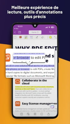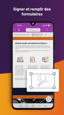 Avec Foxit PDF Editor, l'affichage et la gestion de vos fichiers PDF deviennent un jeu d'enfant. Reformatez aisément les documents pour une lecture confortable, naviguez avec des signets intuitifs et recherchez instantanément n'importe quel texte. L'application facilite également la création de documents, qu'il s'agisse de partir d'une page blanche, de convertir des fichiers Microsoft Office, des images, du texte ou du HTML, ou même de numériser des documents physiques en PDF. La collaboration est simplifiée grâce à la possibilité d'ajouter des annotations, des tampons, de partager directement depuis l'interface ou de synchroniser des fichiers via le Wi-Fi et les services cloud majeurs comme Google Drive et OneDrive, assurant une accessibilité constante sur tous vos appareils.