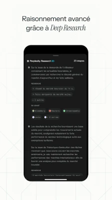 Au cœur de Perplexity réside une ingéniosité de recherche sans précédent. Que vous soyez en quête d'une exploration ciblée avec la Recherche Pro Perplexity ou d'une plongée plus profonde grâce au Deep Research, notre IA vous guide vers des éclaircissements pertinents. Maintenez le fil de vos pensées sans effort grâce au suivi intelligent des discussions, qui conserve le contexte de vos conversations. Libérez votre emploi du temps en déléguant des tâches à votre Assistant intégré, capable de rédiger des courriels, de planifier des rendez-vous ou de réserver des services, le tout en quelques interactions.
